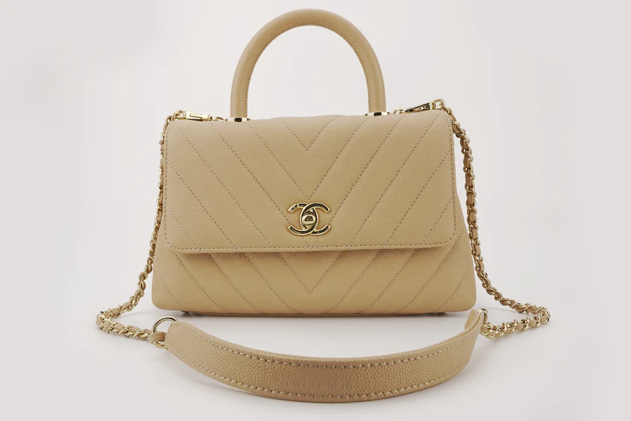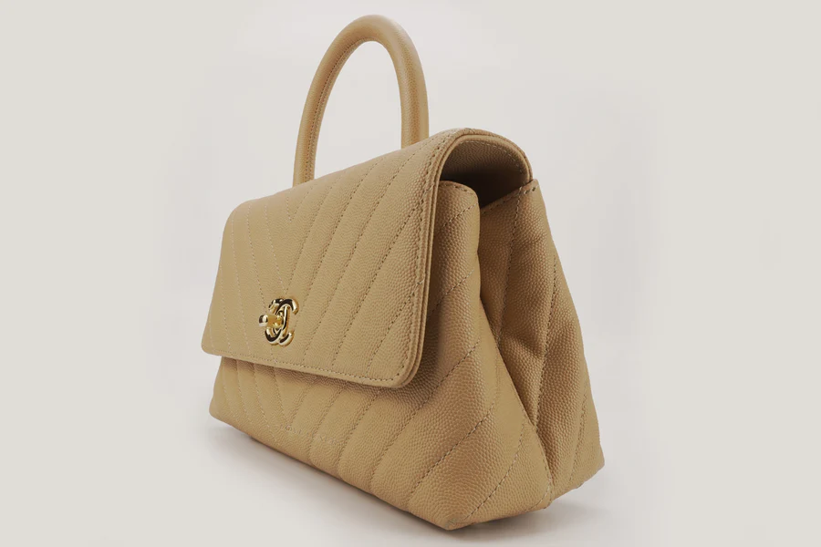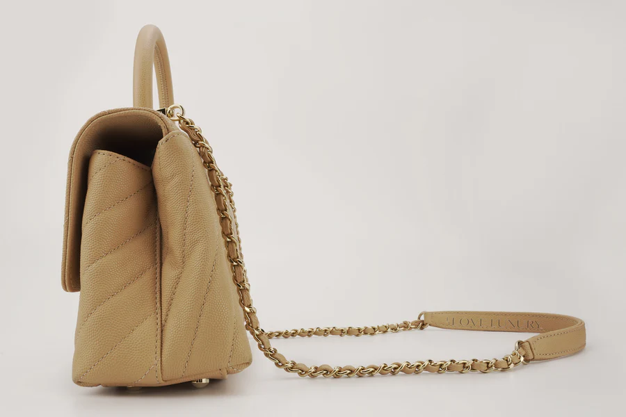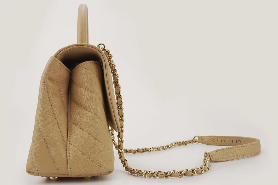 The 2020 Chanel Small Coco Top Handle Flap is in Beige Caviar with Champagne Gold Hardware. Preloved excellence, timeless charm in compact elegance.